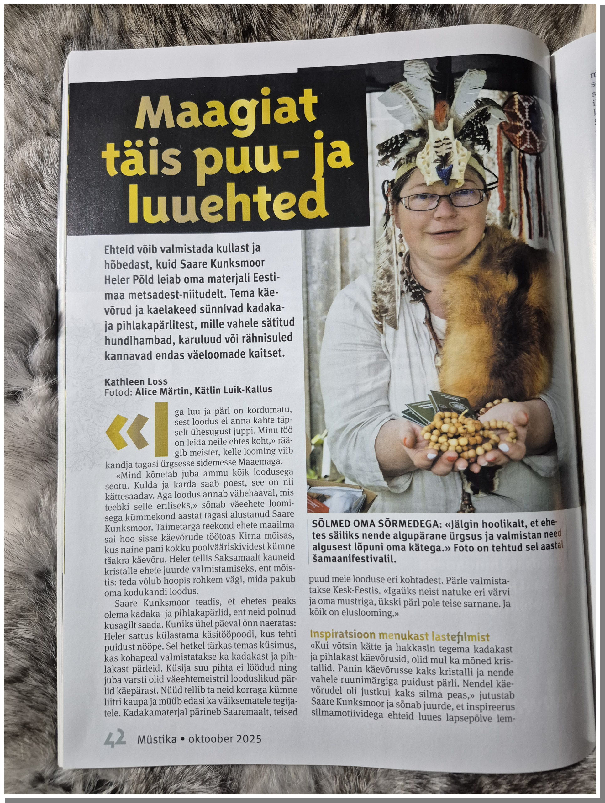 Saare Kunksmoori loodusearmastus voolab tema ehetesse. Artikkel tutvustab loodusmaagia võtete ja rituaalsete esemete loomist, mis aitavad tugevdada väge, enesetunnet ja ruumi energiat. Heler Põld jagab praktilisi nõuandeid puu- ja luuehete valmistamiseks ning nende kasutamiseks igapäevases heaolu toetamisel.