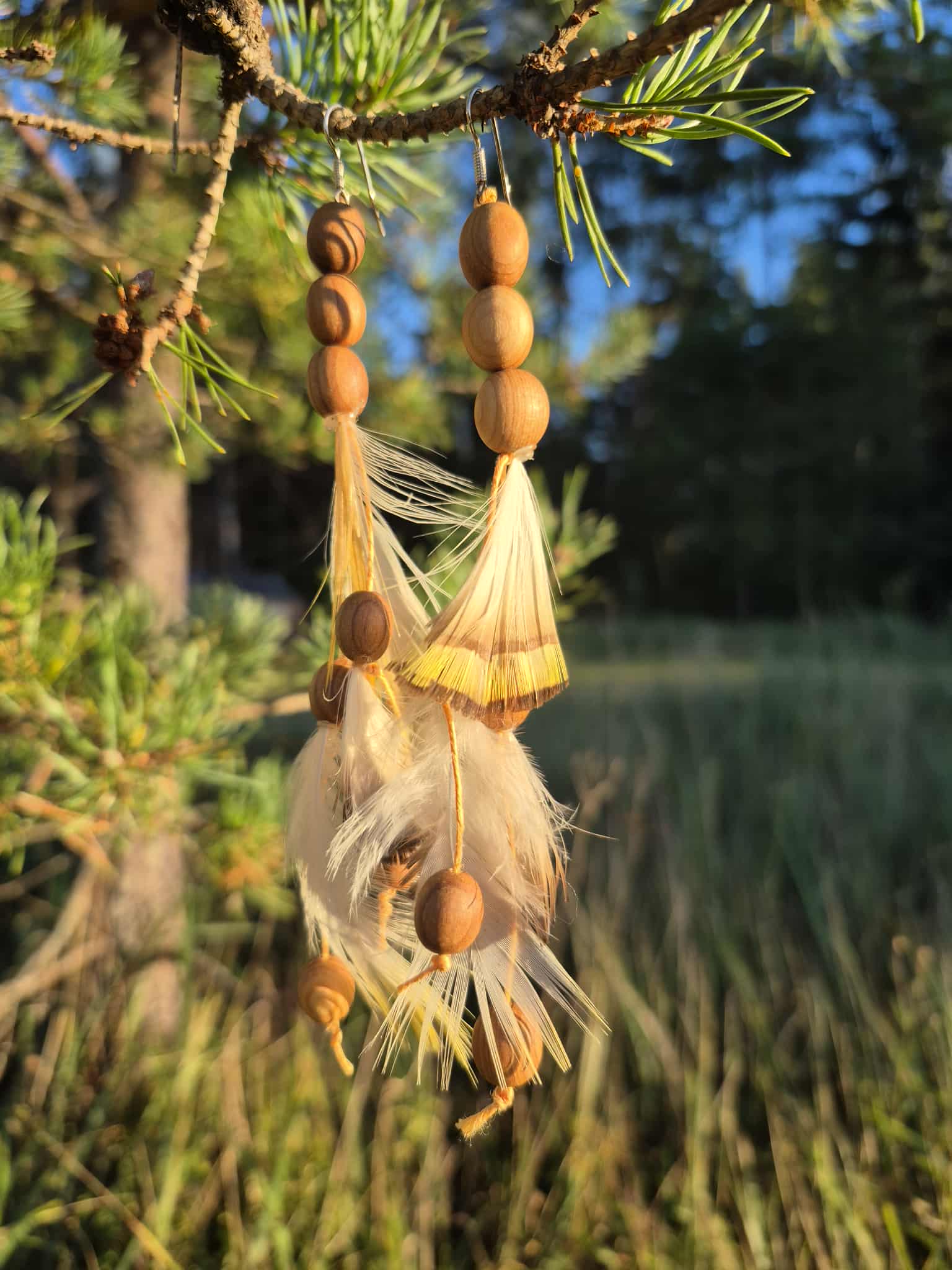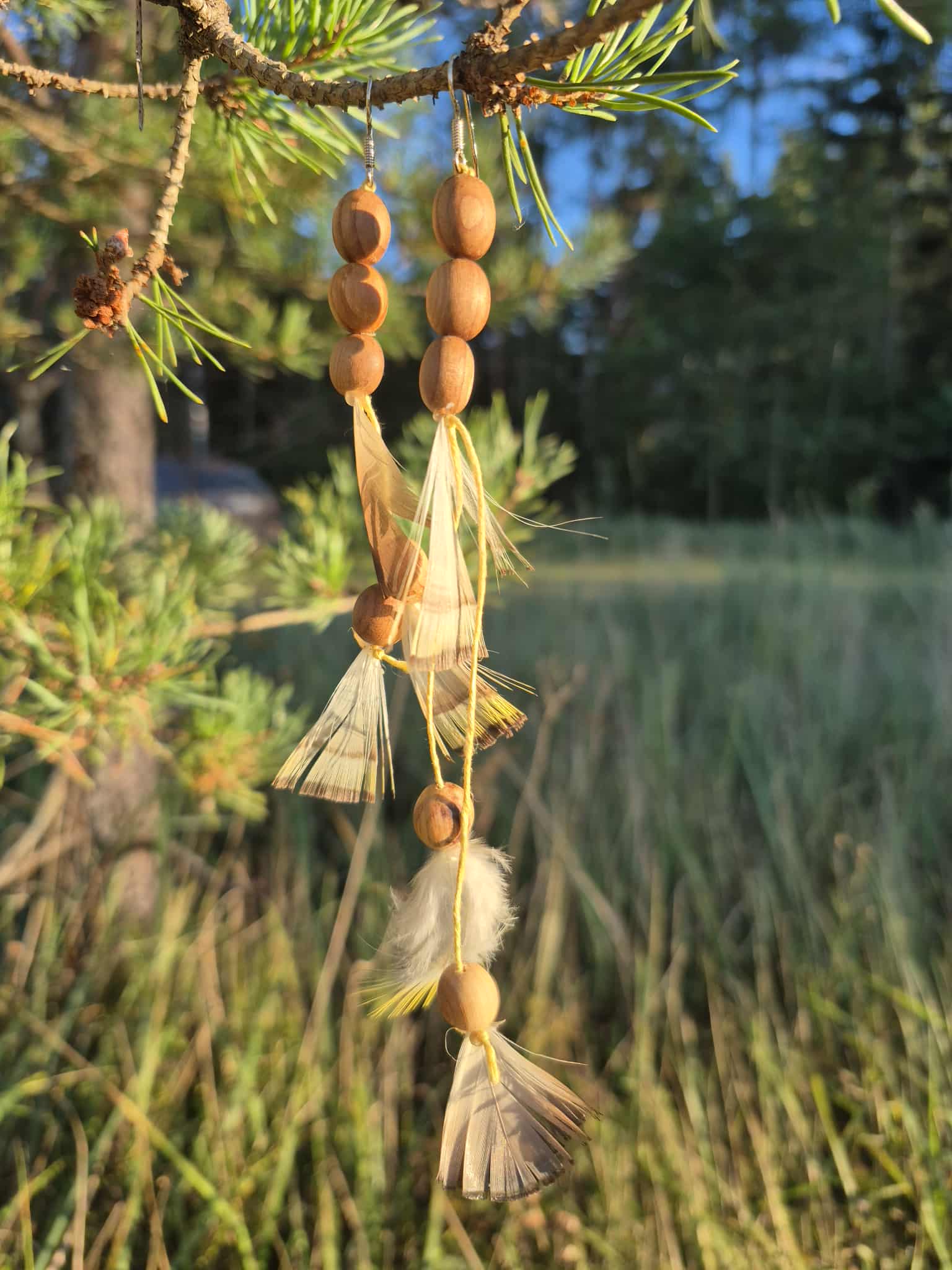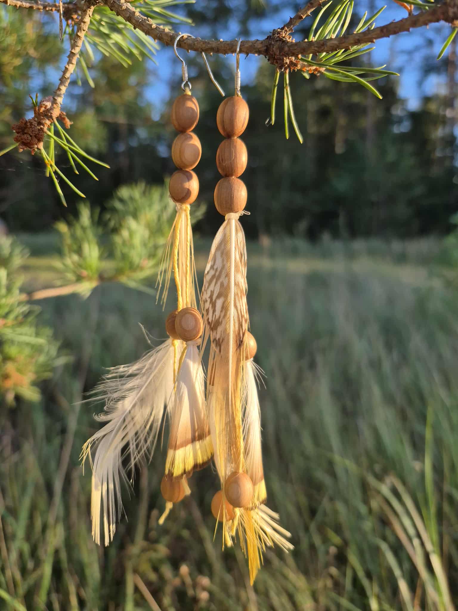 Kõrvarõngad on valmistatud pihlaka puidust pärlitest ja kuldfaasani sulgedest. Kasutatud linast nööri ja hõbekonkse AG925.