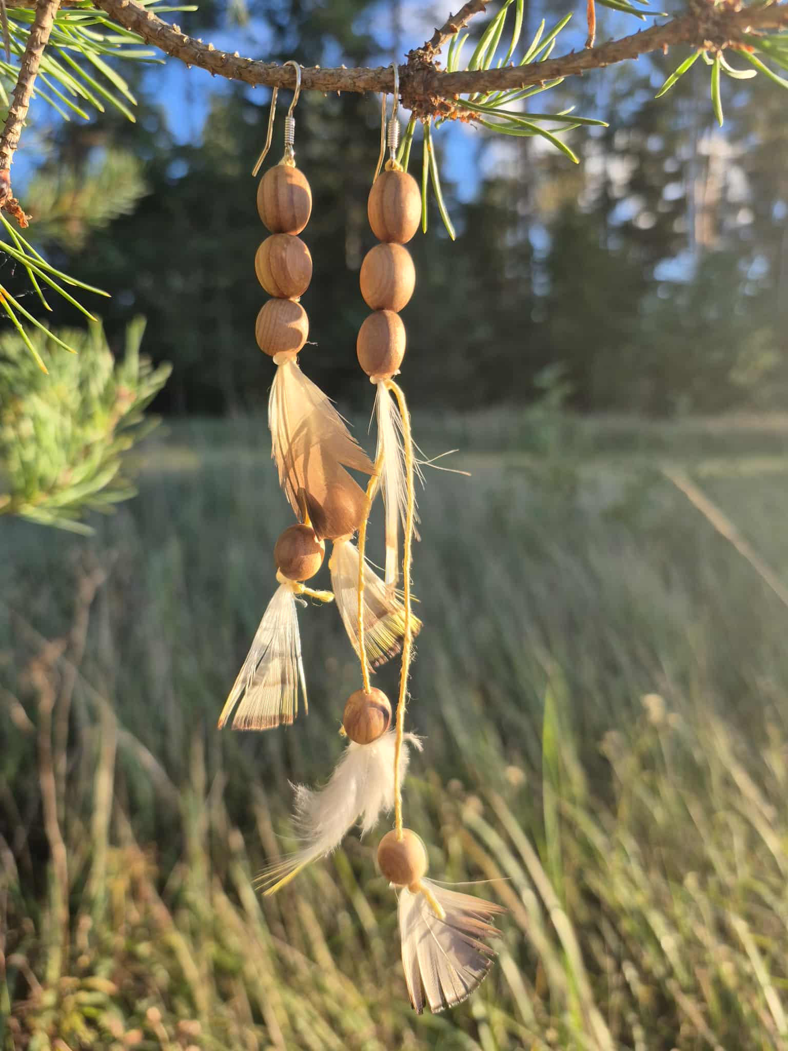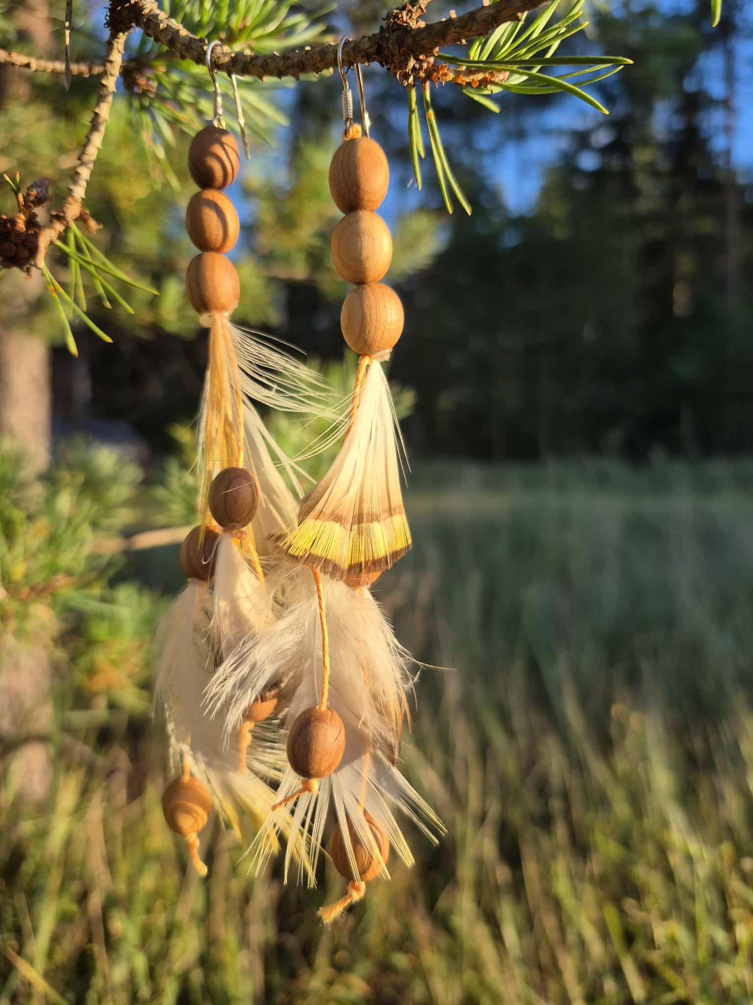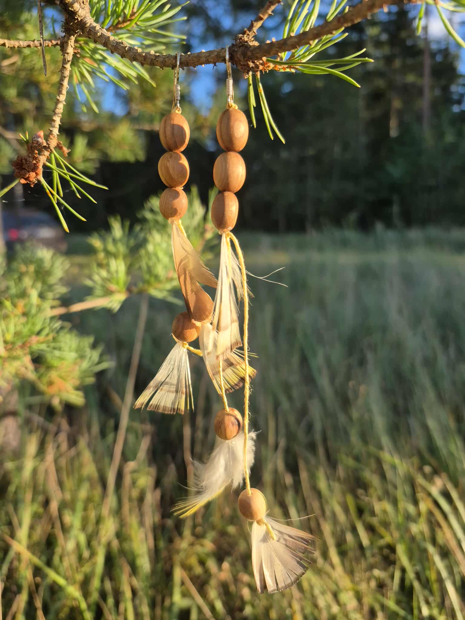 Kõrvarõngad on valmistatud pihlaka puidust pärlitest ja kuldfaasani sulgedest. Kasutatud linast nööri ja hõbekonkse AG925.