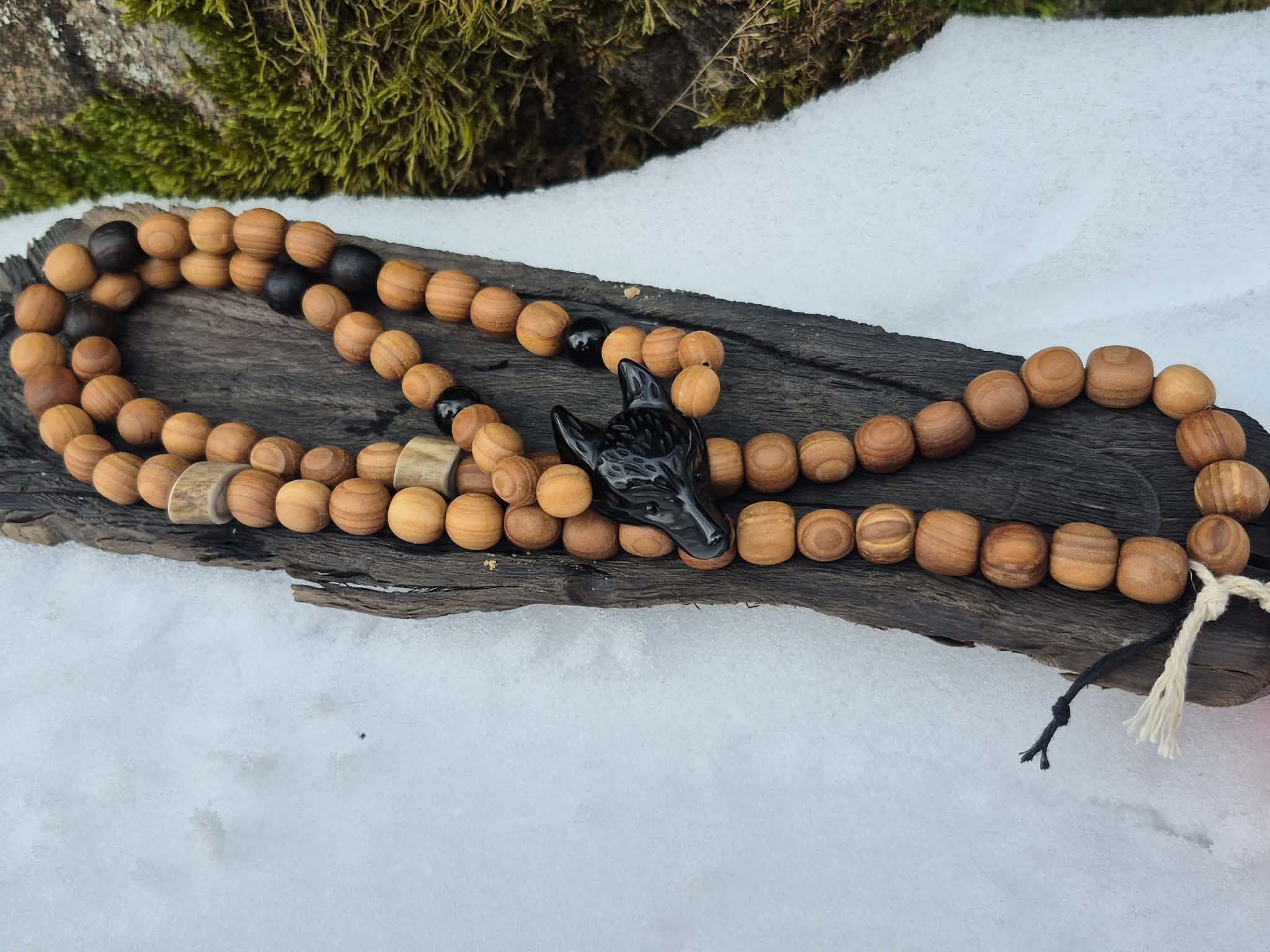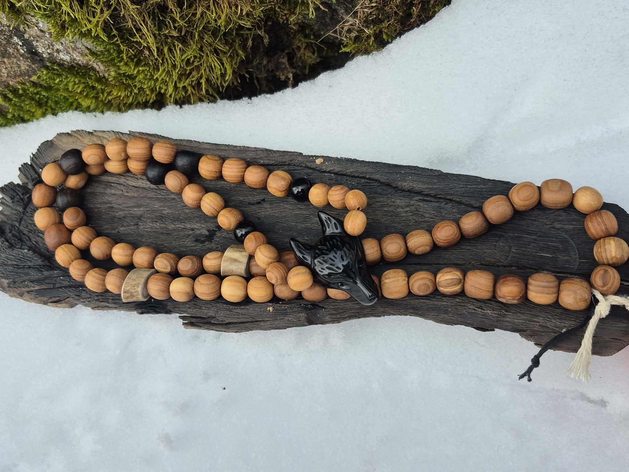 Materjal: 100% pihlaka puit, linane nöör, musta obsidiaani hundipea +2 oonüksi pärli, +4 musta tamme pärli ja põhjapõdra sarveluud 2tk on jõudnud minuni koostöös luukudujaga Hiiumaalt, Galder OÜ.