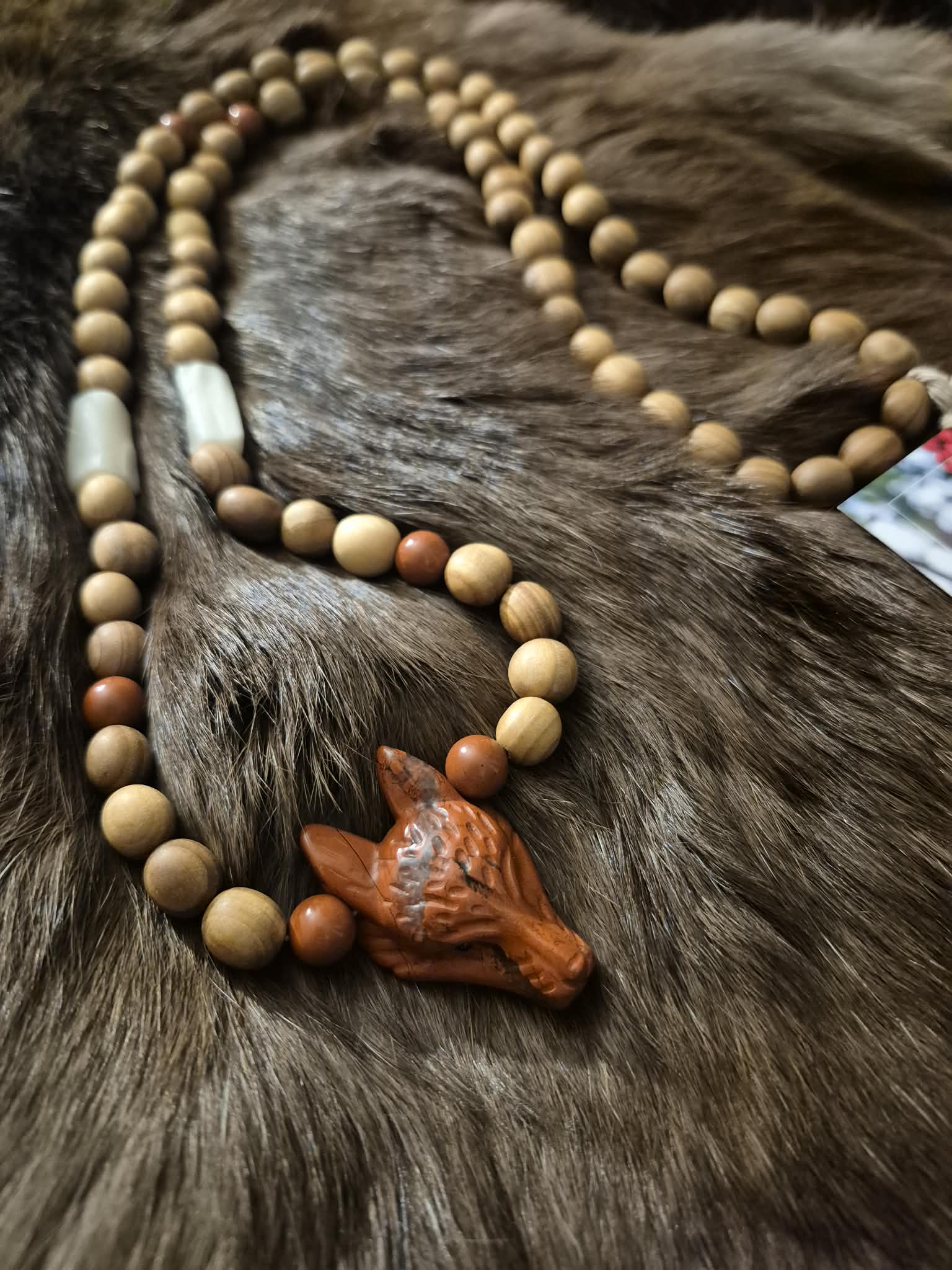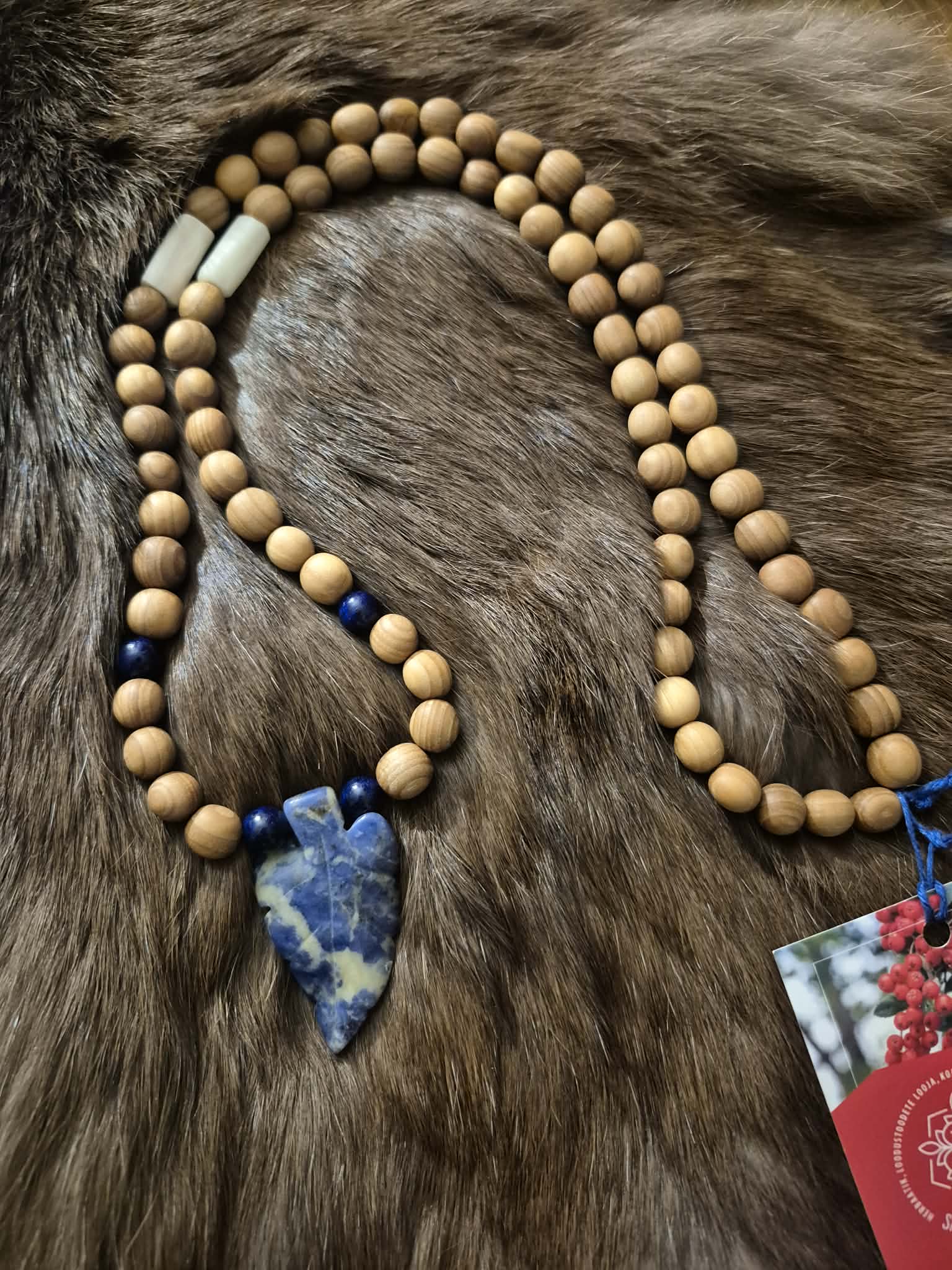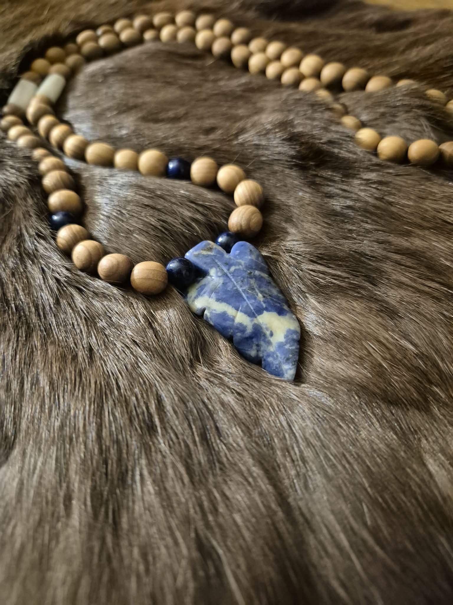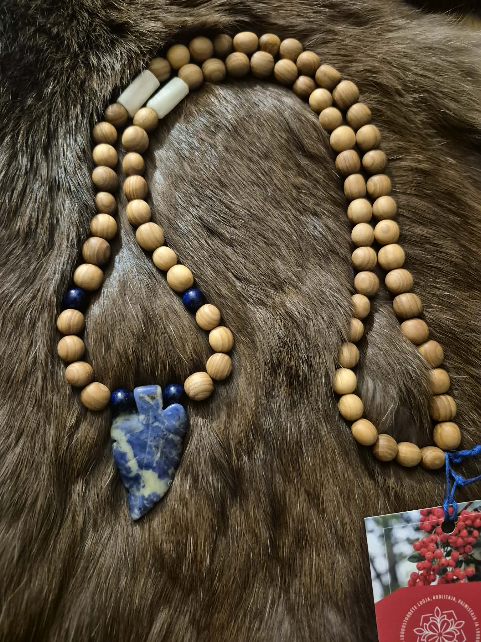 Materjal: 100% pihlaka puit, linane nöör, sodaliidist leheripats, lasuriidist 4 pärli, ja hundiluud 2tk on jõudnud minuni koostöös luukudujaga Hiiumaalt, Galder OÜ.
